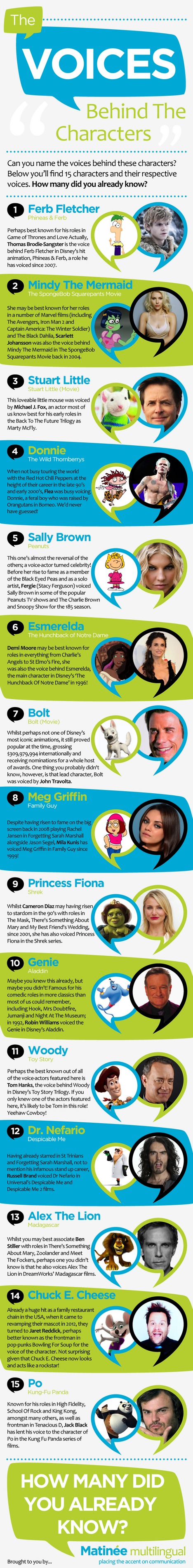 Here we have an enjoyable infographic from the people at Matinée Multilingual that will show you who the voice actors are behind characters for some of your most beloved TV shows and films. See how many of the voice actors you can guess correctly by checking out this quality design.