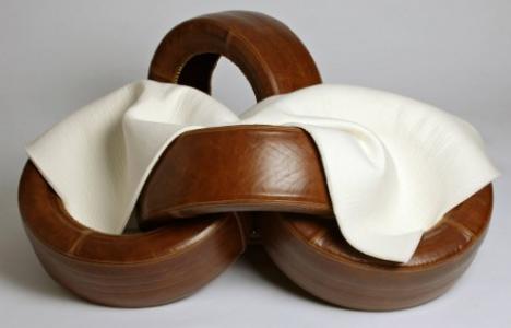 Above: From the British studios of Verna Ventham Design, here we have a series of interlocked tyres to be used as casual seating in the home. Each tyre is leather-bound, its interior covered in felt. Stunning.