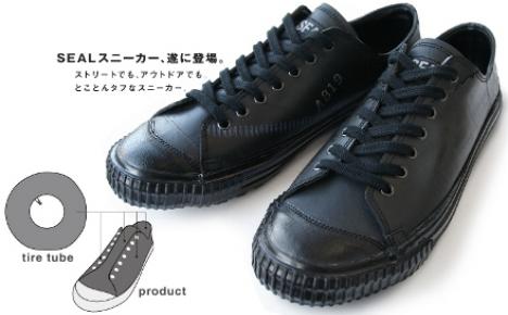 Above: The designers at Seal in Japan are renowned for transforming old tyre products into fashionable, durable consumer goods, and here is just one example: Sneaker 101 - a pair of trainers fashioned from the disused inner-tubes of tyres. Extremely water resistant and desirable.