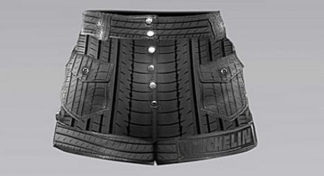 Above: A pair of woman's shorts, made predominantly from tyres by - unsurprisingly given the logo - Michelin. Apparently designed by Michelin staff as "a bit of fun", the shorts were showcased last year as part of a larger collection of tyre fashion. Said Michelin's Peter Snelling at the time: "We hope to see our tyres making tracks on the high street very soon".